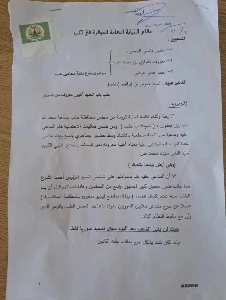 وتقدم المحامون عثمان الخضر، معروف تفتنازي، وأحمد عبدو غرغور بدعواهم أمام النيابة العامة، مؤكدين أن ما قام به المنشد خلال فعالية "لعيونك يا حلب" يمثل "إهانة مباشرة لديانة ملايين المسلمين" ومساسًا بمشاعر السوريين.