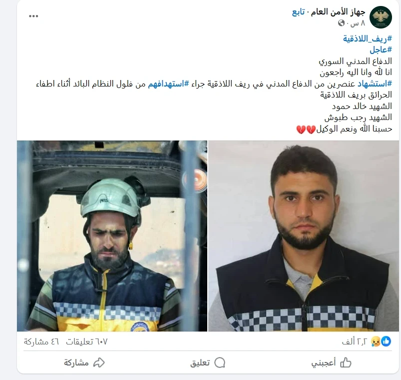 وكانت صفحات على مواقع التواصل الاجتماعي قد زعمت، في منشورات مرفقة بصور، أن متطوعين اثنين من الدفاع المدني قُتلا خلال مشاركتهما في إخماد الحرائق المستمرة في الساحل السوري، جراء هجوم نفذته "فلول من قوات نظام الأسد المخلوع".